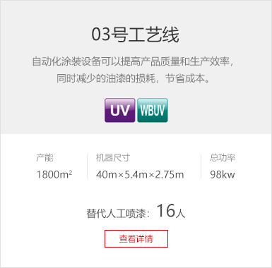 工藝要求 UV底漆、水性色漆、水性LED-UV面漆 產(chǎn)品種類 膜壓PVC櫥柜門板、定制衣柜、線條 產(chǎn)線數(shù)量 4條 設(shè)備特色 LED-UV固化系統(tǒng)、立體干燥房配1臺,待干45分鐘 生產(chǎn)產(chǎn)能 UV底漆噴涂線:1800m2/8h ( 生產(chǎn)員3人/線)
