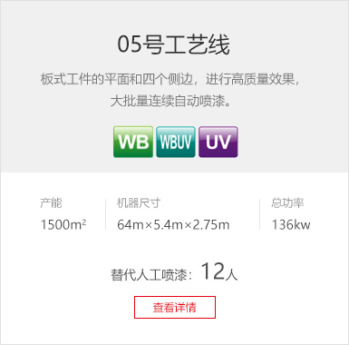 工藝要求 無溶劑uv底漆、水性面漆 產(chǎn)品種類 木門、門套、線條 產(chǎn)線數(shù)量 6條 設(shè)備特色 水性色漆的高質(zhì)量噴涂 生產(chǎn)產(chǎn)能 色漆噴涂線:400套門/8h (生產(chǎn)員3人/線)