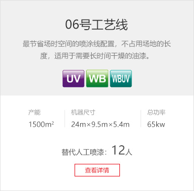 工藝要求 環(huán)保PU底漆、PU面漆 產(chǎn)品種類 實(shí)木復(fù)合門 產(chǎn)線數(shù)量 4條 設(shè)備特色 帶回收的環(huán)保PU漆及立體干燥房,門扇雙面噴漆+立體干燥。 生產(chǎn)產(chǎn)能 600套/天 廢氣處理 干式過(guò)濾+催化燃燒處理系統(tǒng) -