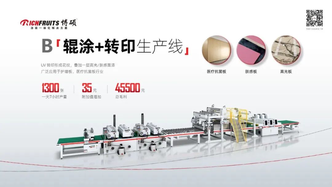 B線:輥涂加轉(zhuǎn)印線,通過UV轉(zhuǎn)印出各式各樣的大理石紋后再做一層膚感或高光的效果,轉(zhuǎn)印是用的冷光源,適用于價格更便宜的PVC轉(zhuǎn)印膜,成本能夠節(jié)省一半。 我們有客戶用這條線做醫(yī)療抗菌板,市場反響非常好;這條線一天7小時理想的產(chǎn)能是1300張48尺板,每塊板的毛利大概是35元,一天毛利是45500元。