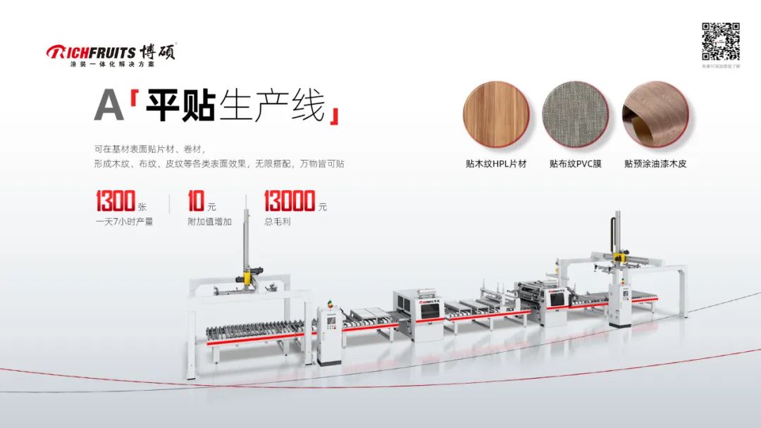 A線:平貼生產(chǎn)線,這工藝相對簡單且投資門檻較低的一條產(chǎn)線,可在基材表面貼上各種膜或片材,做成千種效果,甚至貼上預(yù)涂好油漆的木皮,總之萬物皆可貼;別看我說他工藝簡單,但是產(chǎn)量可不簡單,一天7小時產(chǎn)量是1300張48尺板,增加飾面效果后的每張板附加值增加10元, 那么一天毛利是13000元;當(dāng)然這個是我們估算的理想狀態(tài)下的數(shù)據(jù),作為參考。