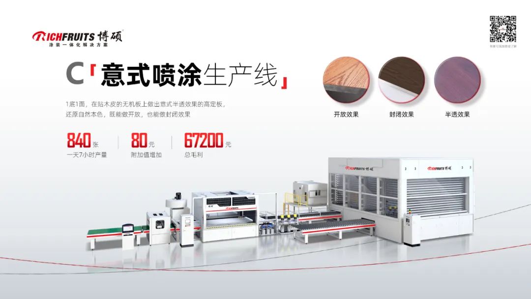 C線:在貼木皮的無機(jī)板上通過噴涂的方式做出意式半透效果的高定板,能夠還原自然本色,既能做開放,也能做封閉效果。這條線的最大特點(diǎn):一鍵換色,一分鐘完成噴槍清洗,柔性化程度高,高定和批量工程都能通用。一天7小時產(chǎn)量是840張48尺板,每塊板的毛利大概是80元, 一天毛利是67200元。