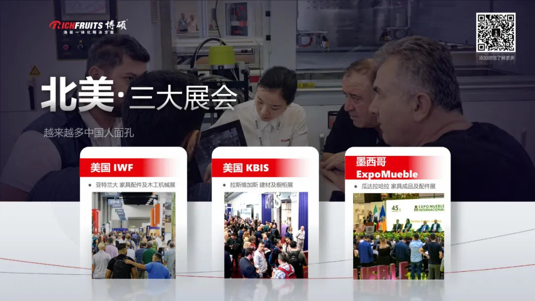 博碩在北美參加了三個(gè)展會(huì),2月份在美國(guó)拉斯維加斯的建材和櫥柜展,博碩的客戶(hù)就有24家參展。今年8月份美國(guó)的IWF, 全美最大的木工機(jī)械展,也不乏中國(guó)企業(yè)的身影,墨西哥瓜達(dá)拉哈拉木工機(jī)械以及家具輔料展,