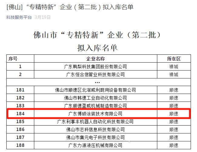 博碩根據(jù)《佛山市經(jīng)濟和信息化局關(guān)于開展佛山市“專精特新”企業(yè)(第二批)入庫的通知》(佛經(jīng)信函[2018]2143號)的要求,按照公開、公平、公正的原則,積極主動申報、服務(wù)機構(gòu)審核推薦、專家組評審等環(huán)節(jié)有幸擬入庫佛山市“專精特新”企業(yè)(第二批)名單。