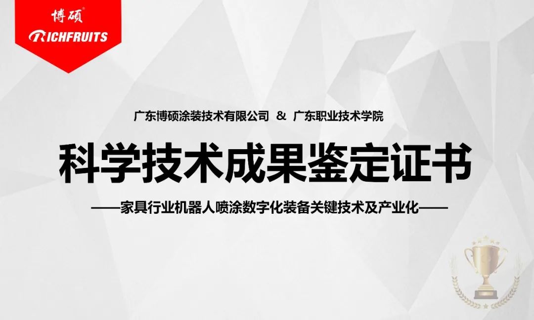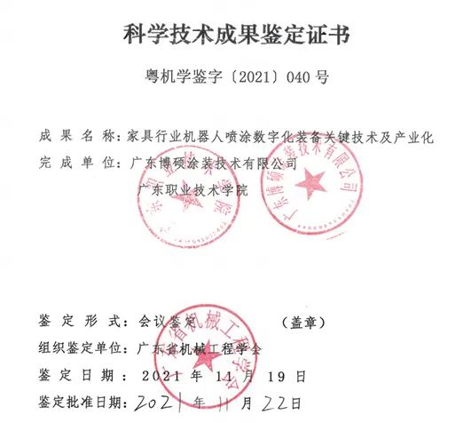 于2021年11月22日,廣東博碩涂裝技術有限公司榮獲關于“家具行業(yè)機器人噴涂數(shù)字化裝備關鍵技術及產(chǎn)業(yè)化”項目的《科學技術成果鑒定證書》