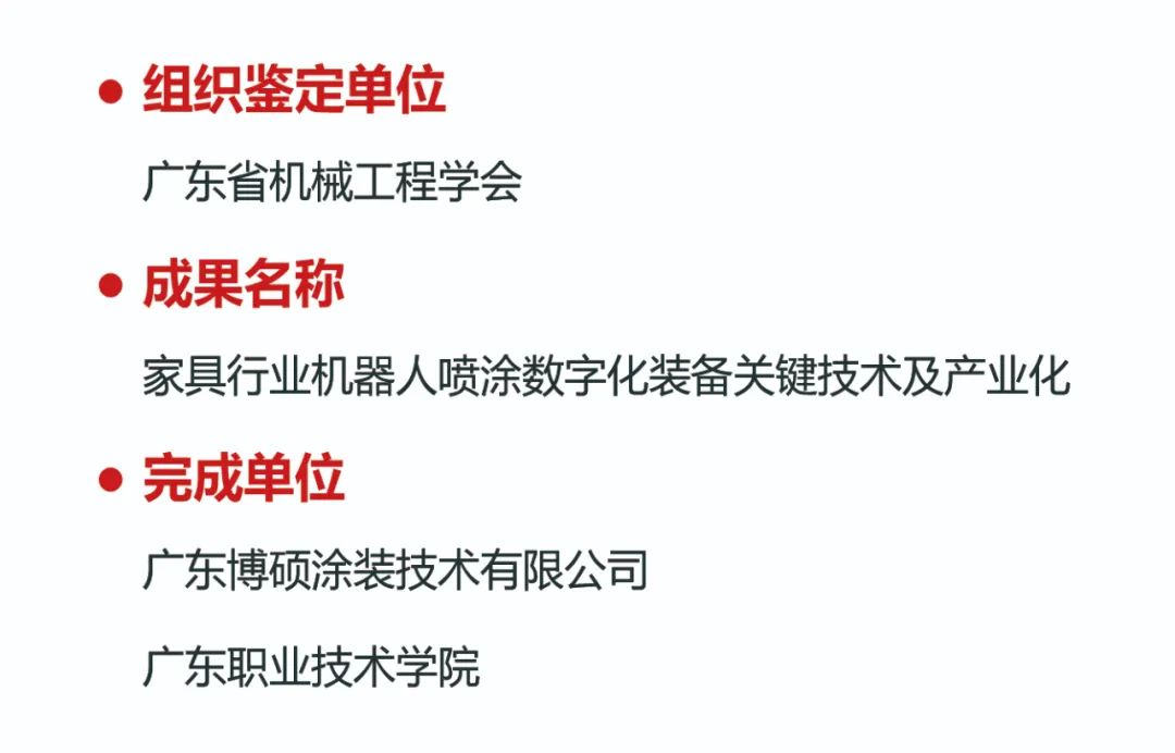 2021年11月19日,由廣東省機械工程學會組織并主持,在佛山市順德區(qū)對廣東博碩涂裝技術有限公司等單位完成的“家具行業(yè)機器人噴涂數(shù)字化裝備關鍵技術及產(chǎn)業(yè)化”項目進行科技成果鑒定。