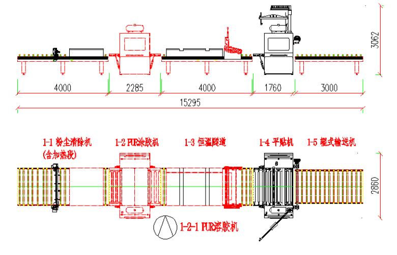本生產(chǎn)線由:粉塵清除機 — PUR涂膠機(含溶膠系統(tǒng)) — 恒溫隧道 — 平貼機 — 輸送機等部分組成。