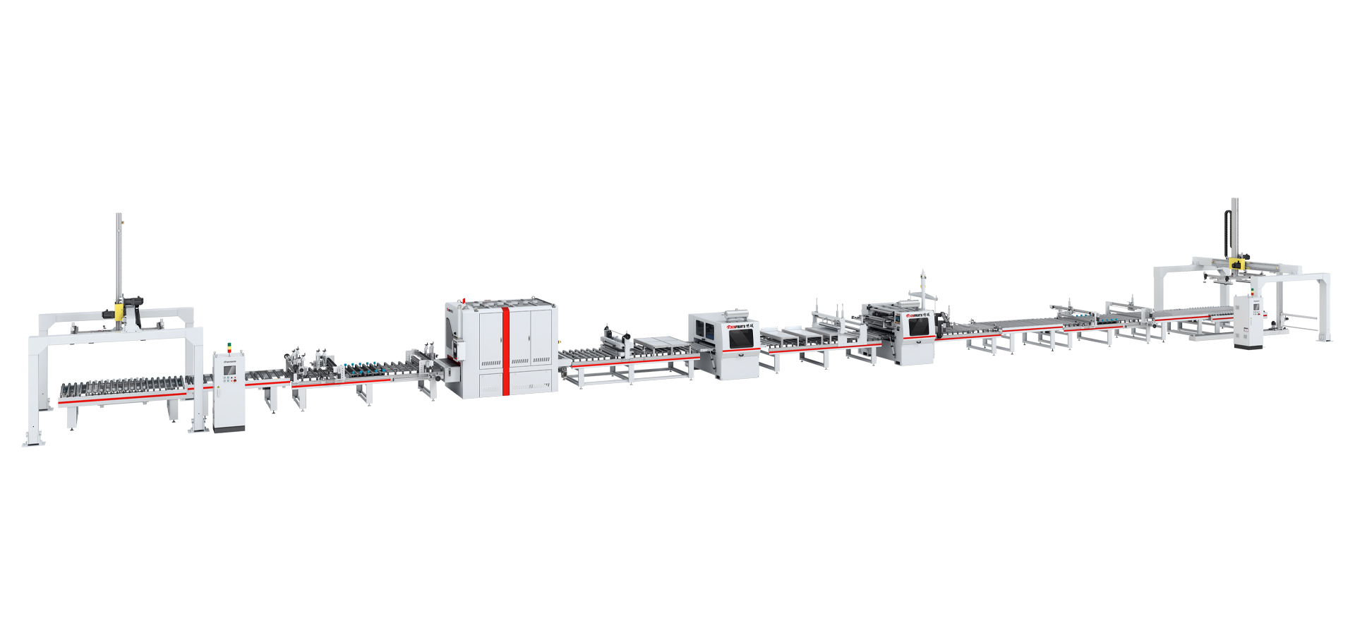 本生產(chǎn)線由:龍門上下料機(jī) — 對(duì)中輸送機(jī) — 輸送機(jī) — 倒角機(jī) — 砂光機(jī) — 粉塵清除機(jī) — PUR涂膠機(jī)(含溶膠系統(tǒng)) — 恒溫隧道 — 平貼機(jī) — 斜切機(jī) — 輸送機(jī) — 精密修邊機(jī) — 輸送機(jī) — 對(duì)中輸送機(jī) — 龍門上下料機(jī) — 拉膜機(jī)等部分組成。