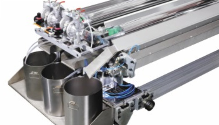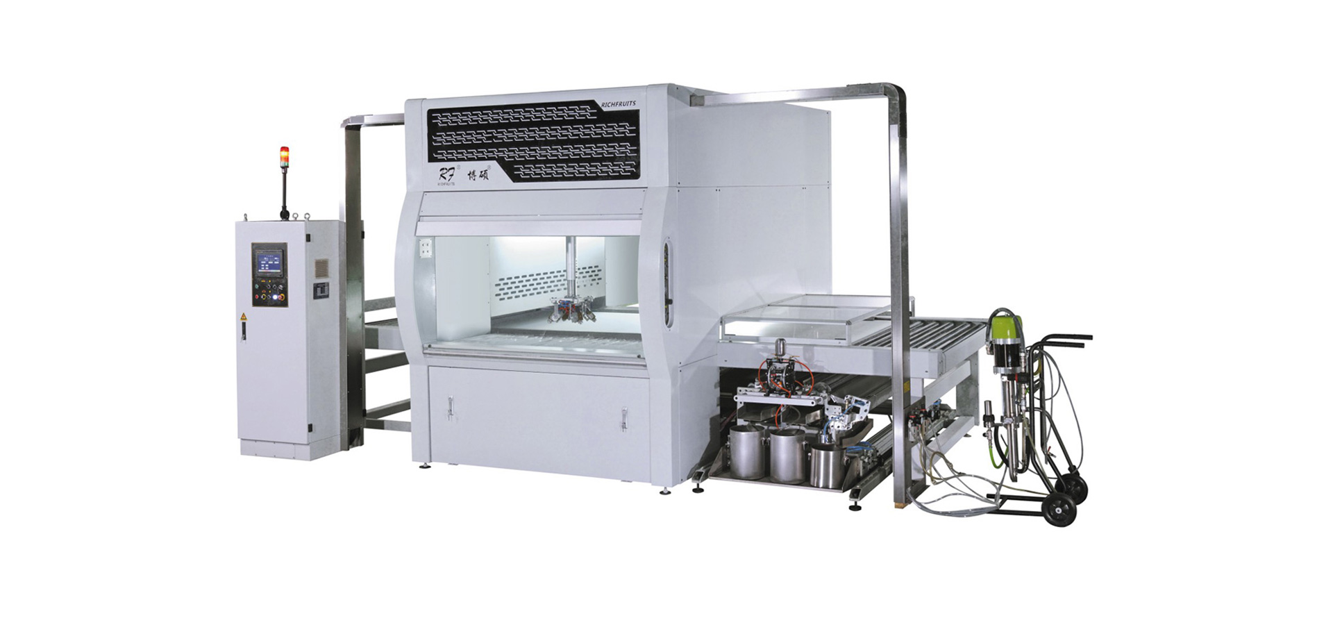 適用于實木家具、實木復合門、美式櫥柜、套房家具、衛(wèi)浴柜、展示柜、工藝品、裝飾板、硅酸鈣板、玻鎂板等板式工件的平面(側(cè)邊少量涂到),針對UV、PU、AC、NC、水性漆和氟碳漆等,進行高質(zhì)量效果連續(xù)自動噴漆,實現(xiàn)節(jié)能、環(huán)保和減少人工,提高產(chǎn)品質(zhì)量和生產(chǎn)效率。