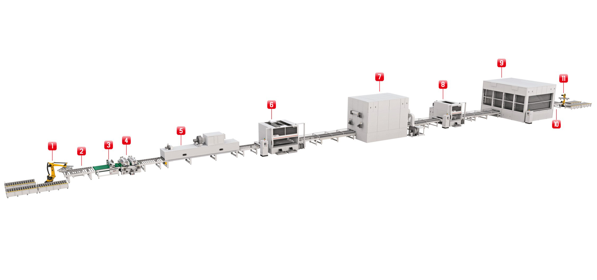 預(yù)輥實(shí)色水性乳膠漆,再噴第一次質(zhì)感涂料,待干后再噴第二次水包水涂料,形成自然立體的火燒石面效果,是外墻最受熱選的一種效果。后段配平鋪式立體干燥房,避免了厚噴漆膜流掛的現(xiàn)象,同時(shí)實(shí)現(xiàn)油漆快速干燥,將能耗降至最優(yōu)。
